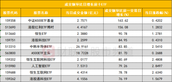 从成交额环比增长前十的ETF来看,中证A500ETF基金(159358)成交额环比增长163%位居首位;港股红利ETF博时成交额环比增长156%位居次席。