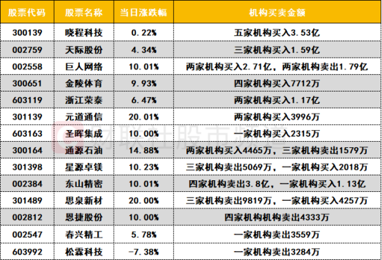 今日龙虎榜机构活跃度明显提升,买入方面,电池股天际股份获三家机构买入1.59亿;机器人股浙江荣泰获机构买入1.17亿。
