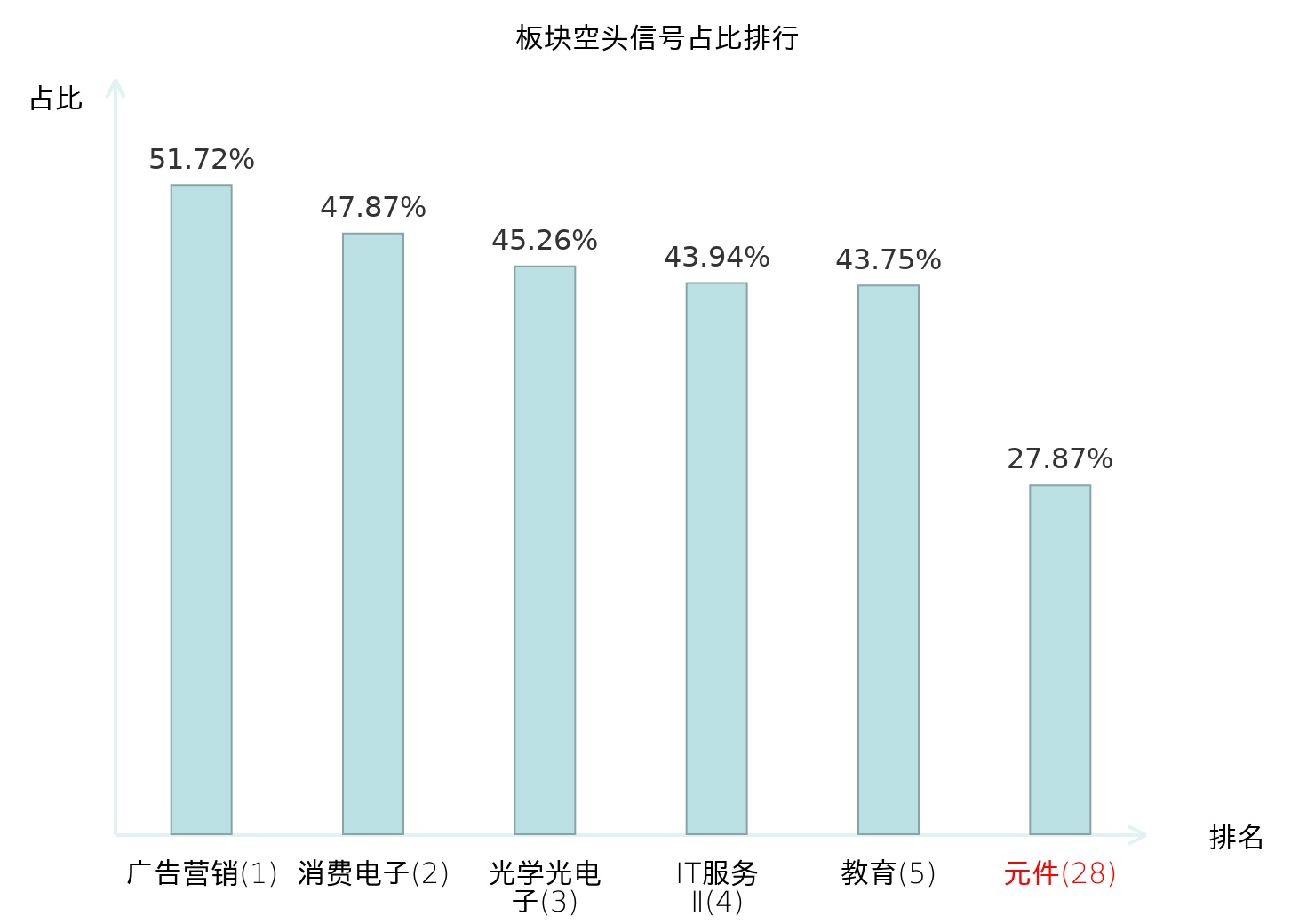 全市场所有行业板块中主力空头信号占比排名中,广告营销板块位居第一。广告营销板块名次提升最快,较昨日上升115位。