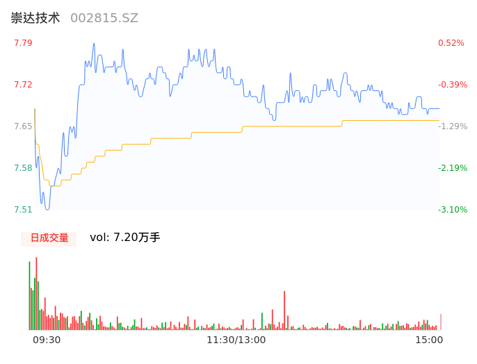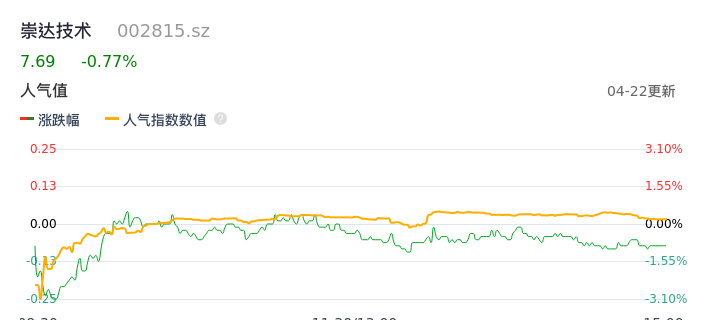 04月22日,崇达技术收报7.69,股价涨幅-0.77%,成交金额5517.27万元,换手率1.12%。