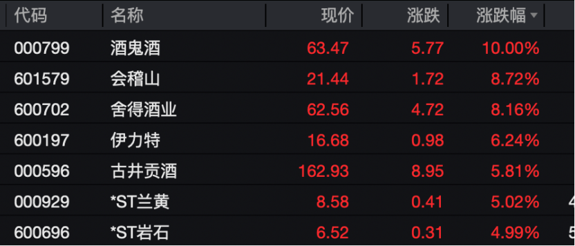 其中,白酒股表现强势,Wind酒类指数涨近1.5%。板块个股中,酒鬼酒涨停,舍得酒业、会稽山涨超8%,伊力特、古井贡酒等多股涨幅超过5%。