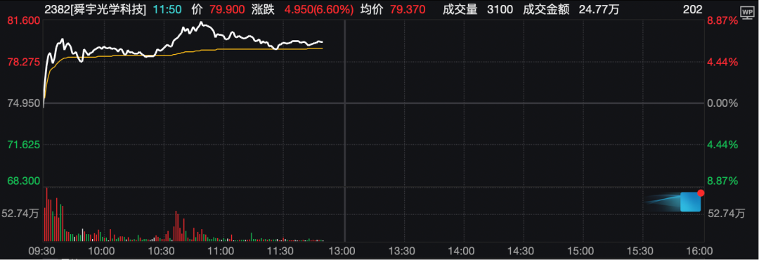 恒生指数成份股中,舜宇光学科技大涨,盘中涨幅一度超过8%。