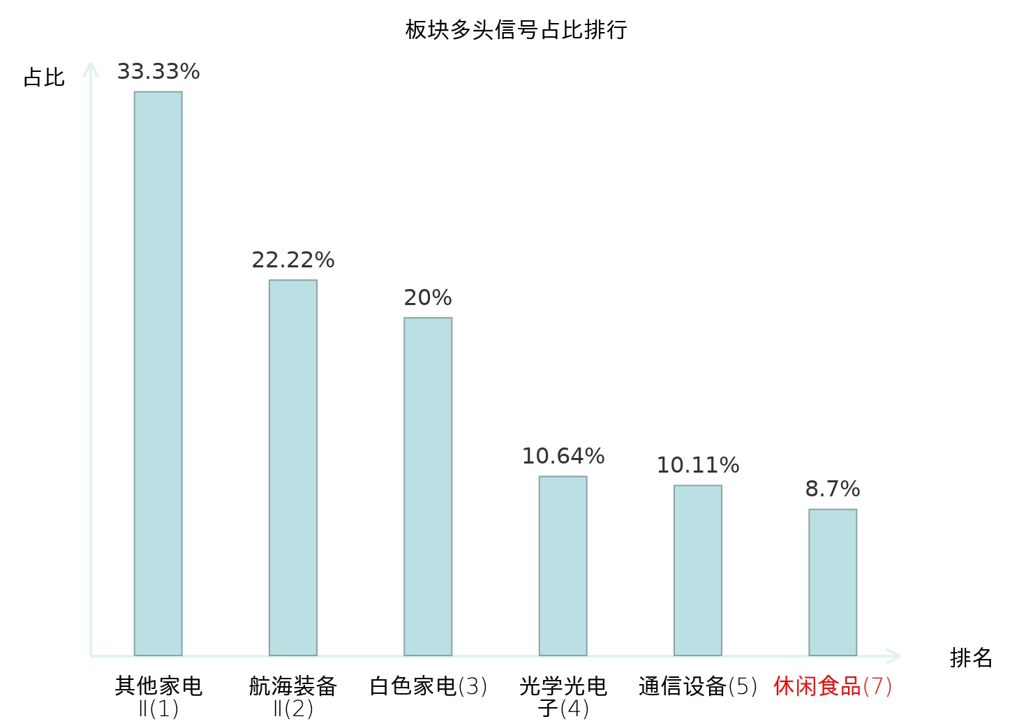 全市场所有行业板块中主力多头信号占比排名中,其他家电Ⅱ板块位居第一。其他家电Ⅱ板块名次提升最快,较昨日上升128位。