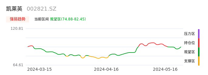 我们来看一下该股的九方特色指标强弱趋势的情况:凯莱英自05月13日从持仓区下穿到观望区。股价近期持续下跌后,短期出现止跌迹象。后续重点关注能否再次站上多空分界点:82.45元。如未能有效突破则可能进入新一轮空头行情。