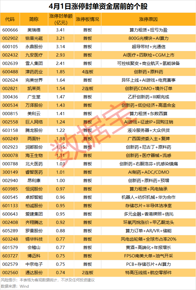 从连续涨停天数看,津药药业已连收4个涨停板,连续涨停板数量最多。多只算力租赁以及光模块个股封单金额居前,奥瑞德、铭普光磁、永鼎股份涨停板封单资金分别为3.41亿元、3.21亿元、3.14亿元。