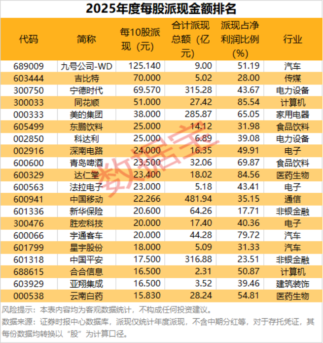 派现公司中,每10股派现金额在10元以上的有55家,每10股派现金额最高的是九号公司-WD,公司拟每10股派现金额为125.14元;其次是吉比特宁德时代等,每10股派现金额分别为70元、69.57元。
