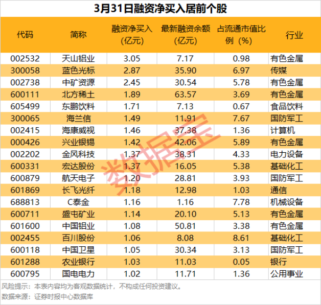 具体到个股,3月31日共有1451只股获融资净买入,净买入金额在千万元以上的有340只,其中19只融资净买入额超1亿元。天山铝业融资净买入额居首,当日净买入3.05亿元;其次是蓝色光标中矿资源,融资净买入金额分别为2.87亿元、2.45亿元;融资净买入金额居前的还有北方稀土东鹏饮料海兰信等。