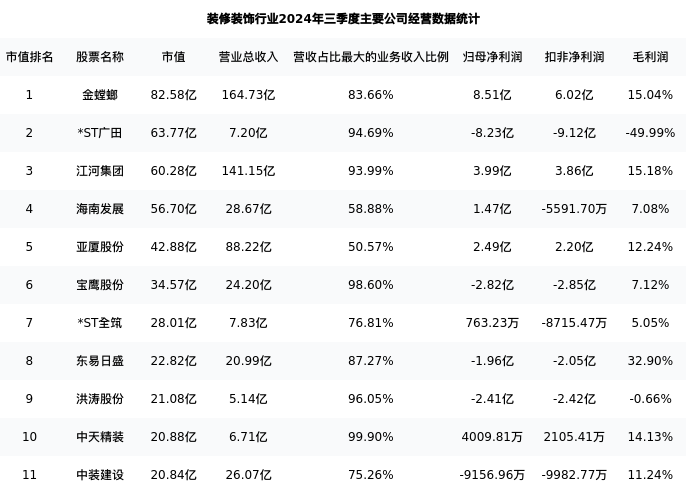 中装建设最新报告期数据为三季度,下表汇总了装修装饰行业内市值靠前的公司三季度主要经营数据