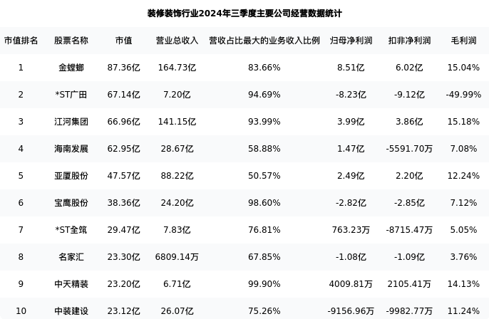 中装建设最新报告期数据为三季度,下表汇总了装修装饰行业内市值靠前的公司三季度主要经营数据