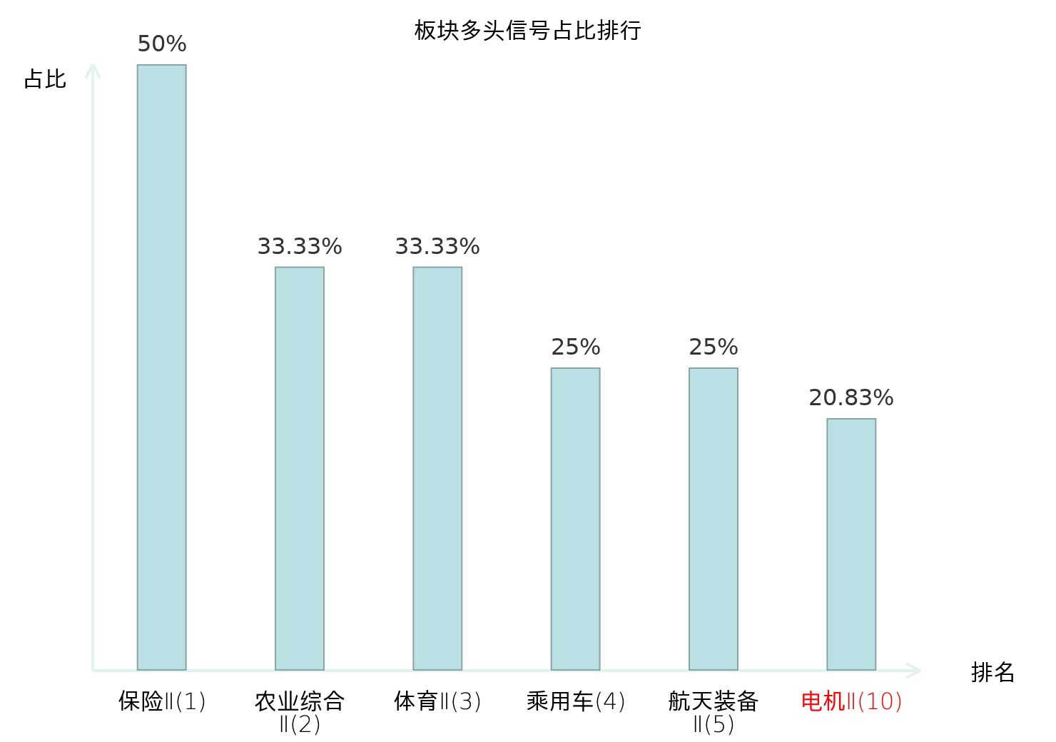 全市场所有行业板块中主力多头信号占比排名中,保险Ⅱ板块位居第一。体育Ⅱ板块名次提升最快,较昨日上升127位。