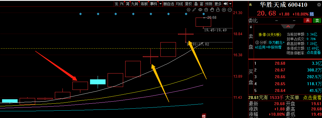 另外一个就是华胜天成,这个也是首板给大家讲到的,他的股性也是趋势板,而且属于趋势板中的强势走势。里面的主力是个急性子,每次就是洗盘一天,第二天就着急反包。我估计里面的主力也是不想浪费牛市行情,打算一口气吃成胖子。