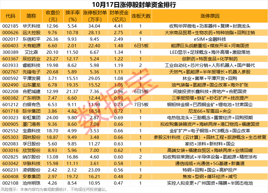 以封单金额计算,10股封单资金均超1亿元,华天科技、远大控股、东信和平封单资金居前,分别为4.41亿元、2.75亿元、2.49亿元。