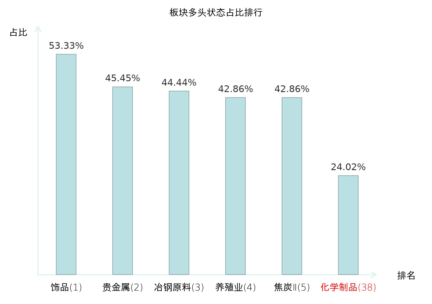 全市场所有行业板块中主力多头状态占比排名中,饰品板块位居第一。非金属材料Ⅱ板块名次提升最快,较昨日上升58位。