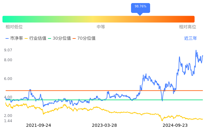 高争民爆当前市净率PB为8.41,在所属的化学制品中,市净率PB排157,前五名分别为吉华集团市净率0.57、闰土股份市净率0.66、苏博特市净率0.70、久日新材市净率0.70、海新能科市净率0.74。高争民爆当前市净率PB为8.41,超过近3年98.76%的历史数据。