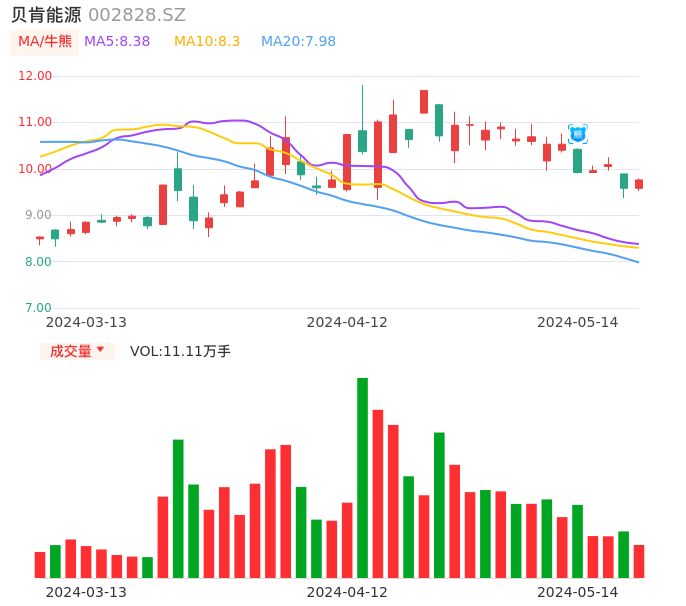 05月14日,贝肯能源收报9.76,股价涨幅1.88%,成交金额1.08亿元,换手率5.74%。