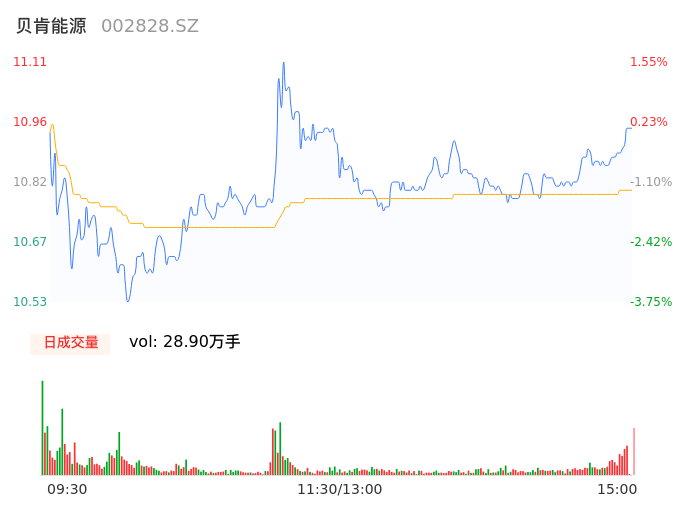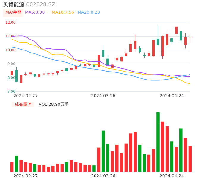 04月24日,贝肯能源收报10.95,股价涨幅0.09%,成交金额3.12亿元,换手率14.92%。