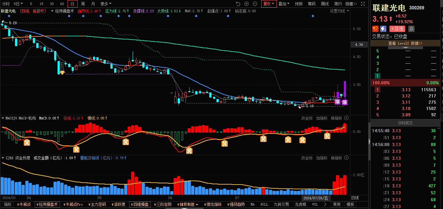 3)参考技术指标:联建光电-经伟操盘术指标-出现爆点信号