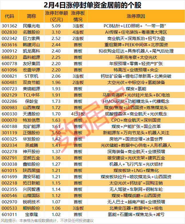 以封单金额计算,民爆光电、名雕股份、巨力索具等涨停板封单资金居前,分别有5.09亿元、3.10亿元、2.52亿元。从封单力度(封单量占流通A股比例)来看,民爆光电、名雕股份、凯龙高科等力度较大,分别为22.05%、14.98%、11.73%。