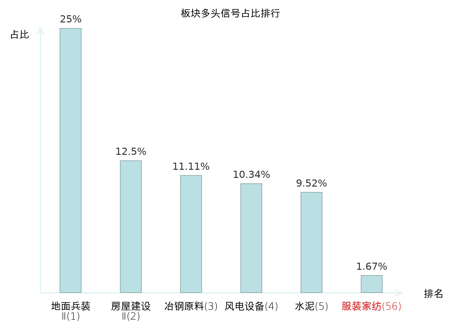 全市场所有行业板块中主力多头信号占比排名中,地面兵装Ⅱ板块位居第一。房屋建设Ⅱ板块名次提升最快,较昨日上升117位。