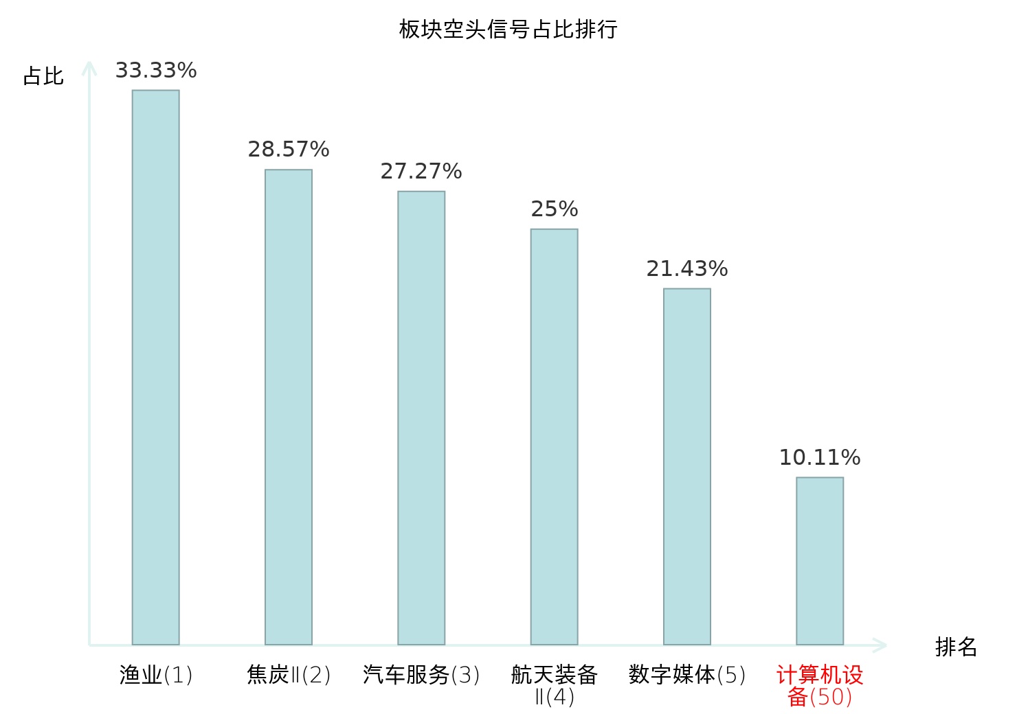 全市场所有行业板块中主力空头信号占比排名中,渔业板块位居第一。电子化学品Ⅱ板块名次提升最快,较昨日上升116位。