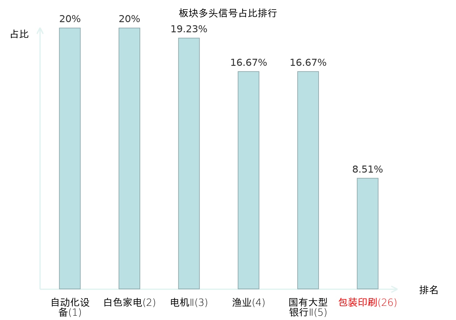 全市场所有行业板块中主力多头信号占比排名中,自动化设备板块位居第一。渔业板块名次提升最快,较昨日上升118位。