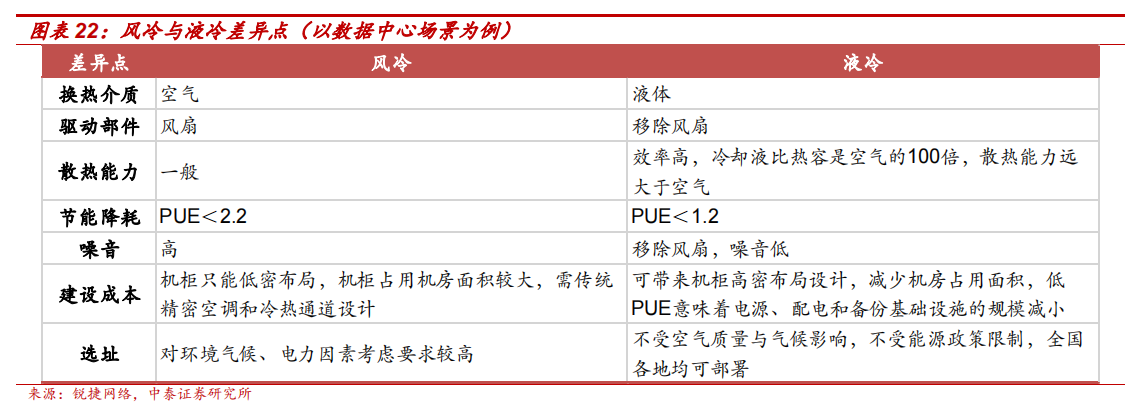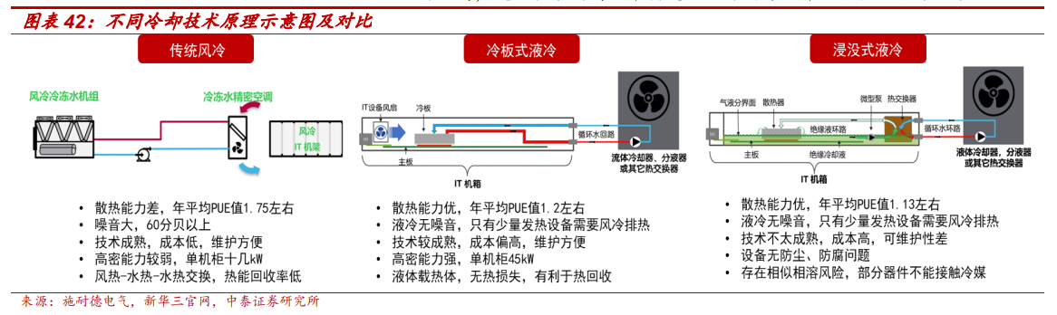 液冷相比具有散热效率高、噪音低、冷却均匀性好等优势,更加适应高功率密度发展趋势,占比有望快速提升。
