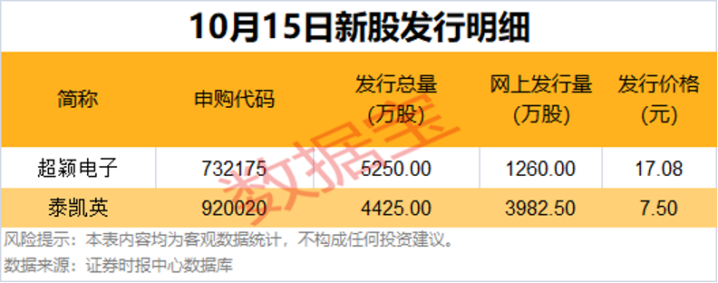 今日共有2只新股申购,分别为沪市主板的超颖电子,北交所的泰凯英。