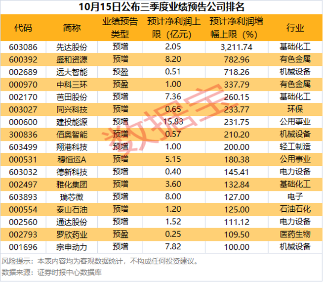 三季度业绩预告密集披露,今日(10月15日)近40家公司发布三季度业绩预告,其中,预增29家,预盈3家。以预计净利润增幅上限统计,业绩预增预盈股中,共17股预计净利润增幅超100%。