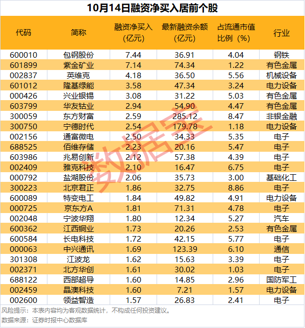 具体到个股,10月14日获融资净买入1亿元以上的有42只,其中,13股获融资净买入额超2亿元。