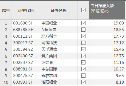 上证报中国证券网讯Choice数据显示,1月28日,资金净流入额排名前十的个股依次是中国铝业、恒运昌、北方稀土、网宿科技、天孚通信、省广集团、英维克、中芯国际、香农芯创、洛阳钼业。其中,中国铝业获净流入19.09亿元。