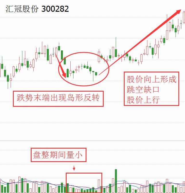 岛形部分的成交量一般比跳空前下跌时成交量还要小,表现出一种特有的萎缩整理特征,而在股价脱离岛形盘整部分时成交量显著扩大。