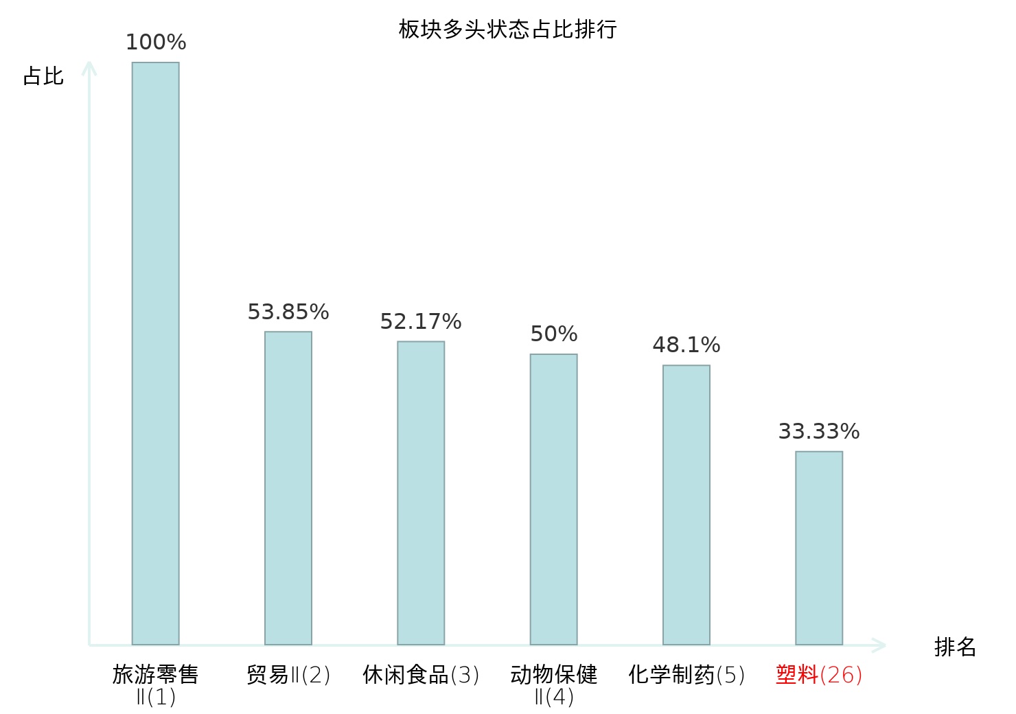全市场所有行业板块中主力多头状态占比排名中,旅游零售Ⅱ板块位居第一。白酒Ⅱ板块名次提升最快,较昨日上升47位。