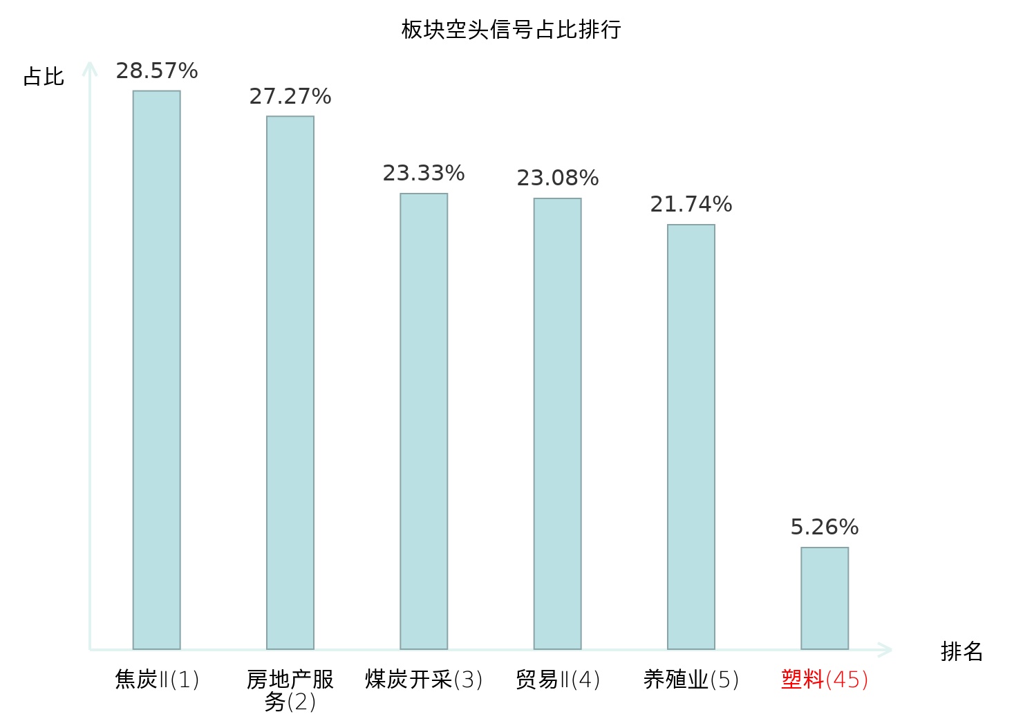 全市场所有行业板块中主力空头信号占比排名中,焦炭Ⅱ板块位居第一。养殖业板块名次提升最快,较昨日上升107位。