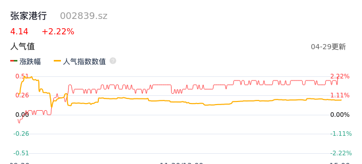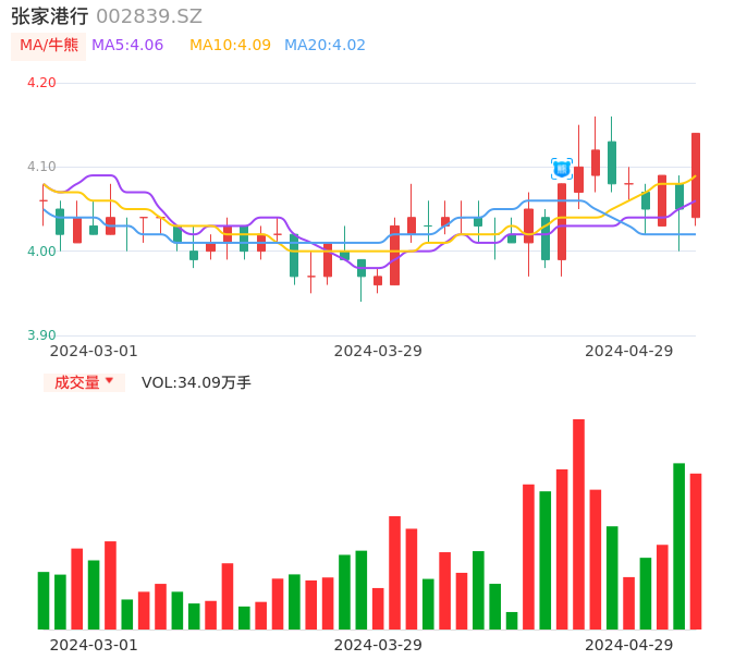 04月29日,张家港行收报4.14,股价涨幅2.22%,成交金额1.40亿元,换手率1.65%。