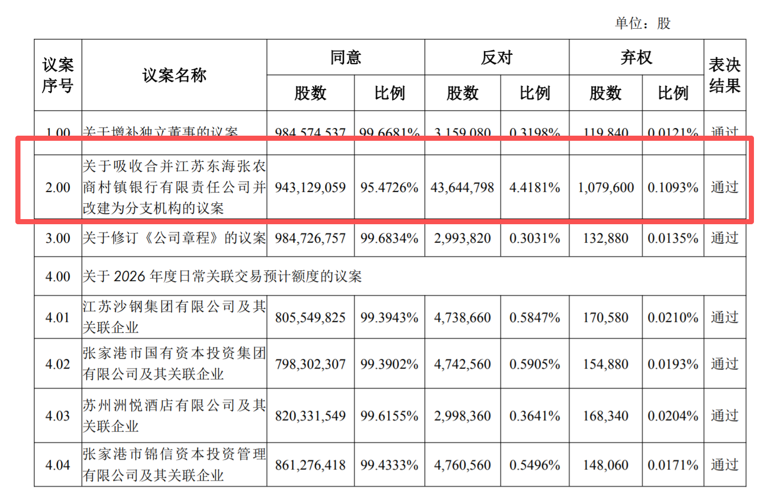 上证报中国证券网讯近日,张家港行披露的2026年第一次临时股东会决议公告显示,该行股东会审议通过了关于吸收合并江苏东海张农商村镇银行并改建为分支机构的议案,该议案获得95.47%赞成票,4.42%反对票,另有0.11%弃权票。