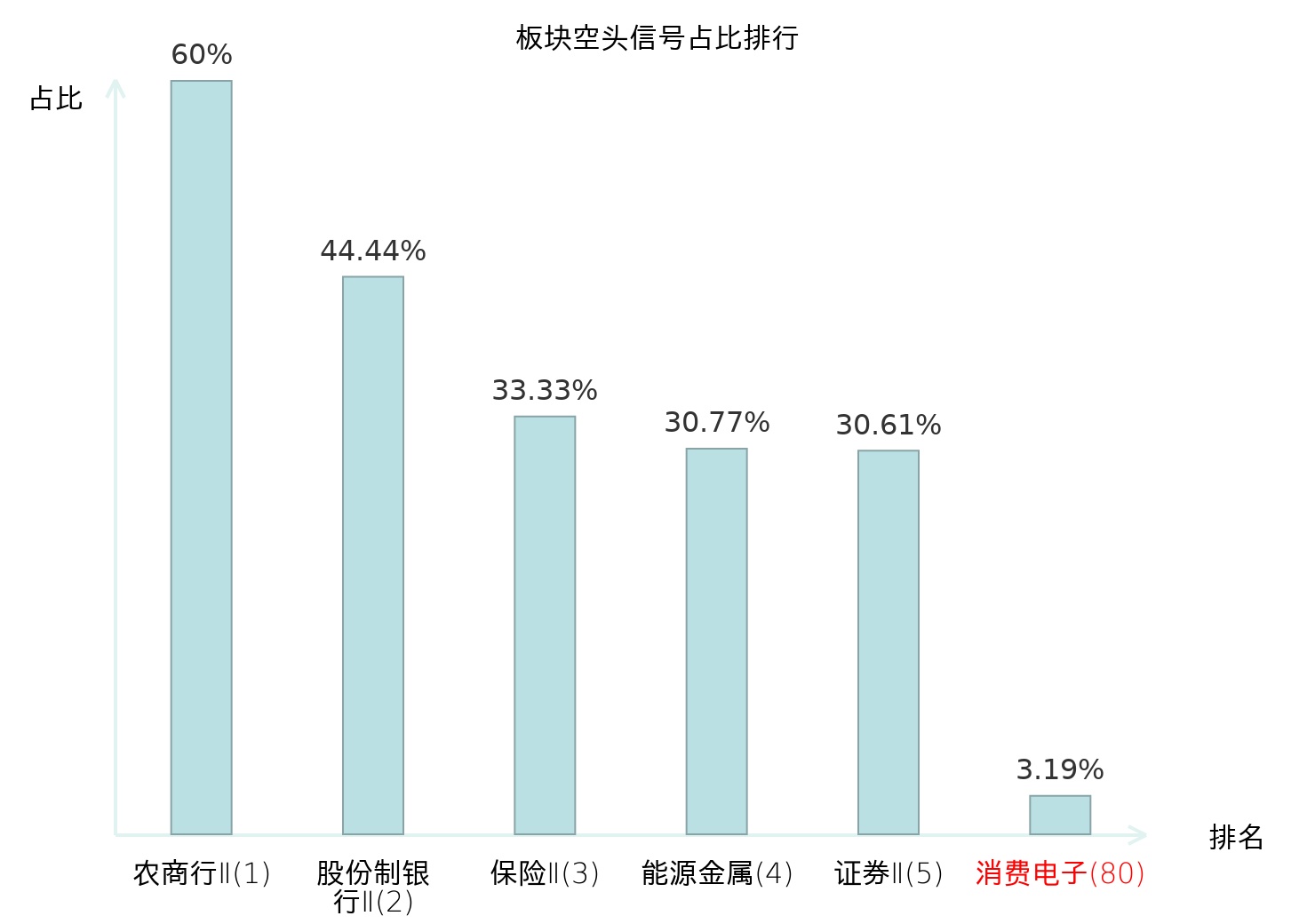 全市场所有行业板块中主力空头信号占比排名中,农商行Ⅱ板块位居第一。证券Ⅱ板块名次提升最快,较昨日上升119位。