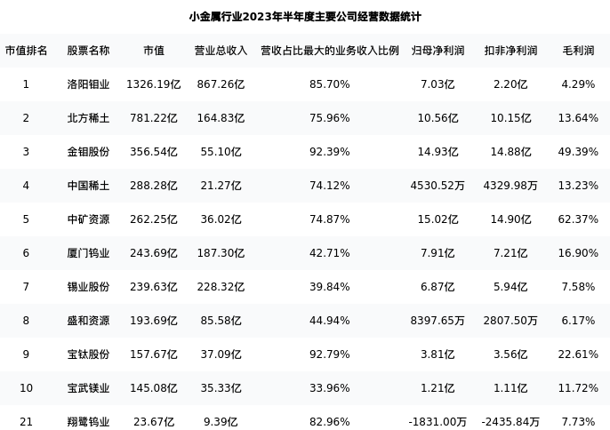 翔鹭钨业最新报告期数据为半年度,下表汇总了小金属行业内市值靠前的公司半年度主要经营数据