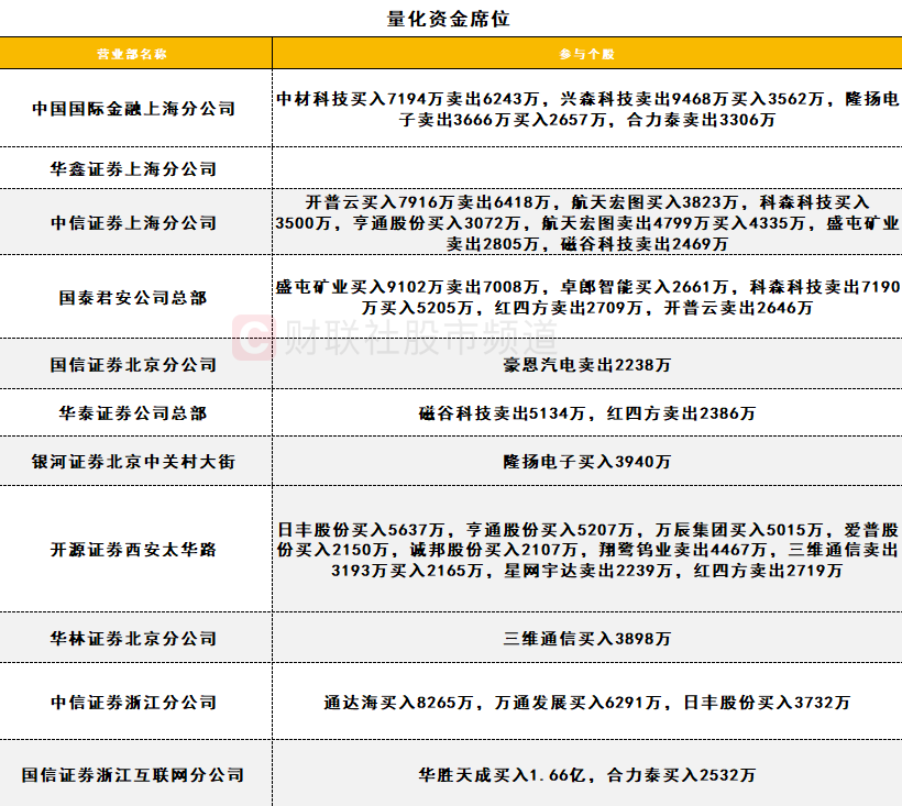 量化资金活跃度一般,华胜天成获一家量化席位买入1.66亿。
