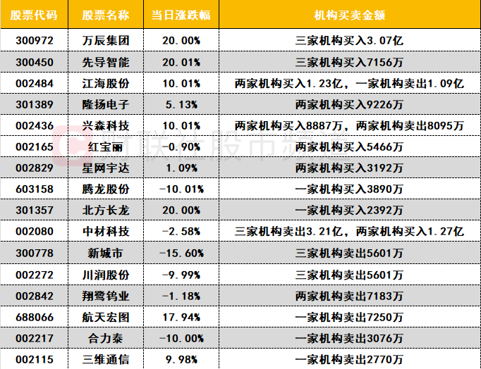 卖出方面,中材科技遭机构卖出3.21亿,同时获机构买入1.27亿;翔鹭钨业遭机构卖出超7000万;卫星通信概念股航天宏图遭机构卖出超7000万。
