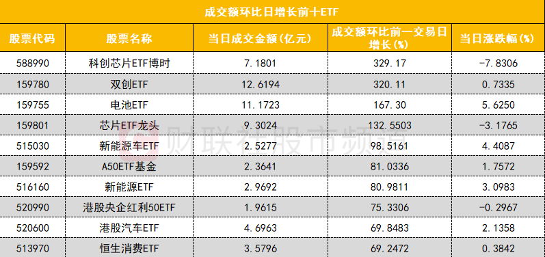 从成交额环比增长前十的ETF来看,科创芯片ETF博时(588990)成交额环比增长329%位居首位。