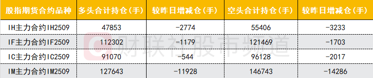 四大期指主力合约多空双方均减仓,且空头减仓数量均大于多头,其中IM合约空头减仓数量明显大于多头。