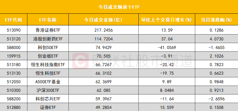 从成交额前十的ETF来看,香港证券ETF(513090)成交额位居首位,港股创新药ETF(513120)成交额位居次席。
