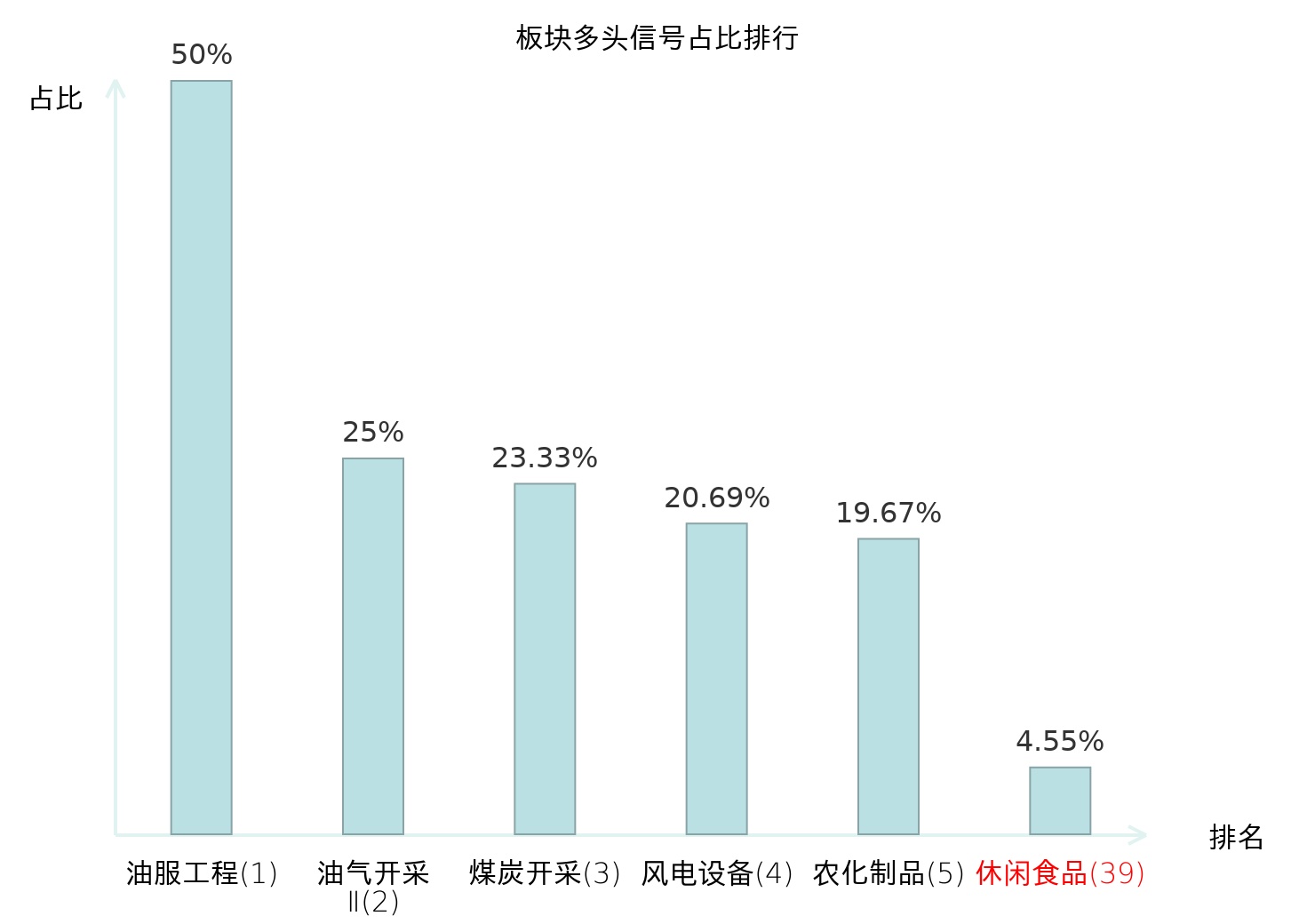 全市场所有行业板块中主力多头信号占比排名中,油服工程板块位居第一。油气开采Ⅱ板块名次提升最快,较昨日上升125位。