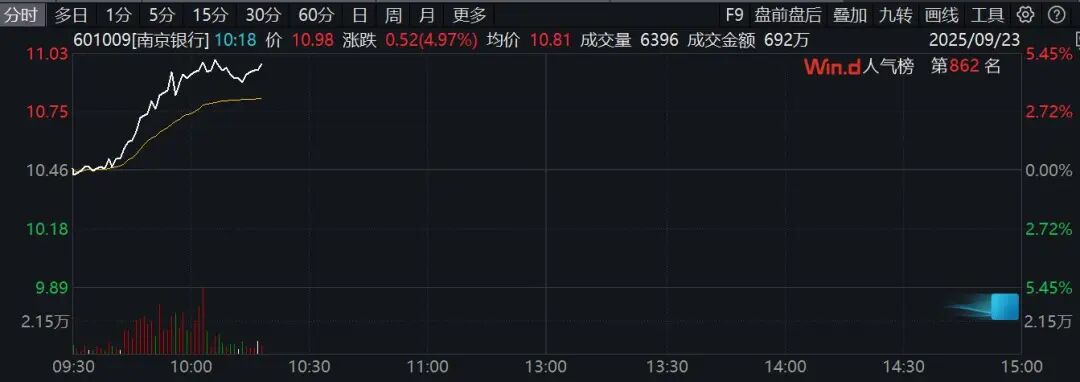银行股震荡拉升,截至发稿,南京银行涨超4%,工商银行、农业银行涨超2%,交通银行、邮储银行、杭州银行、中国银行等纷纷走高。