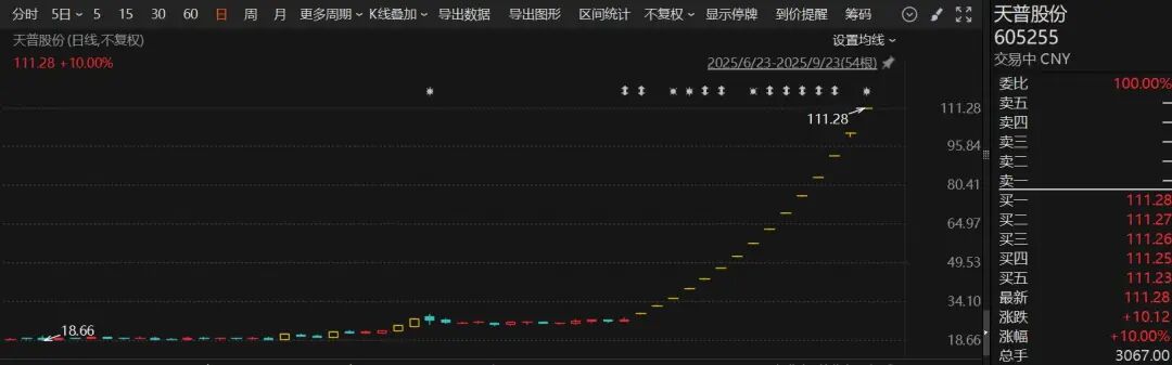 个股方面,天普股份(605255)开盘涨停。8月22日—9月23日,天普股份连续斩获了15个涨停板。