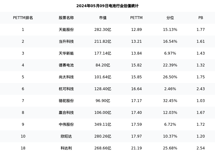 从估值角度看:科达利最新市盈率PETTM为21.19,在行业内排名18/93,处于25.68分位。