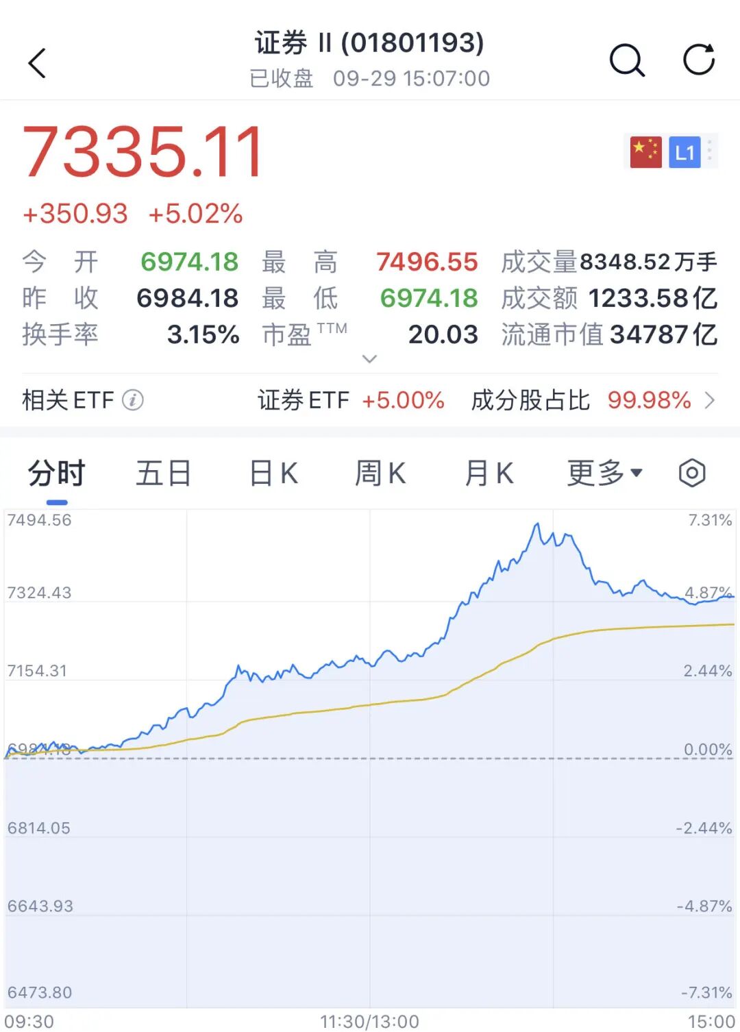 券商板块午后一度涨超7%,截至收盘,该板块仍涨超5%。个股方面,华泰证券、国盛金控、广发证券涨停;中信证券涨近6%,盘中一度逼近涨停;东方财富涨近6%,成交额突破300亿元,全市场排第一。