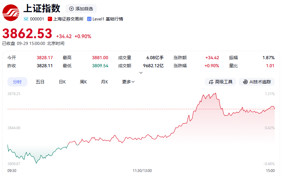 9月29日,A股午后强势拉升,沪指一度涨超1%,创业板指一度涨超3%;港股亦走强,恒生指数涨近2%,恒生科技指数涨超2%。