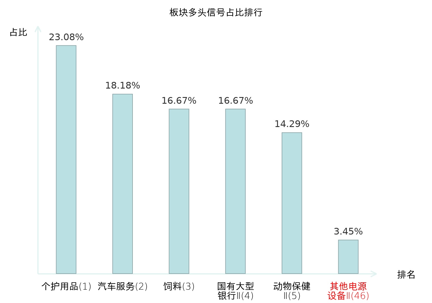 全市场所有行业板块中主力多头信号占比排名中,个护用品板块位居第一。国有大型银行Ⅱ板块名次提升最快,较昨日上升119位。