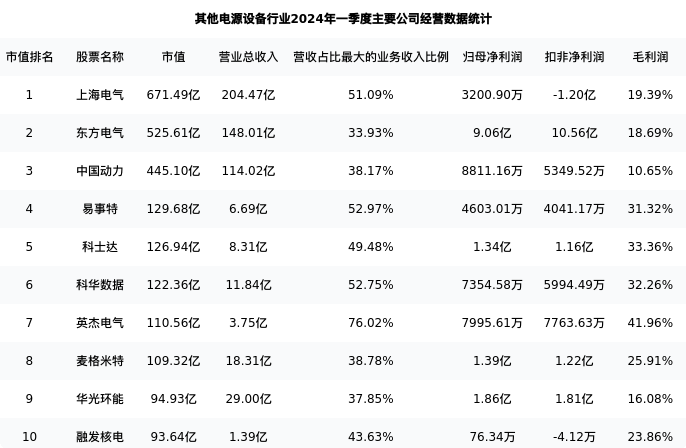 麦格米特最新报告期数据为一季度,下表汇总了其他电源设备行业内市值靠前的公司一季度主要经营数据